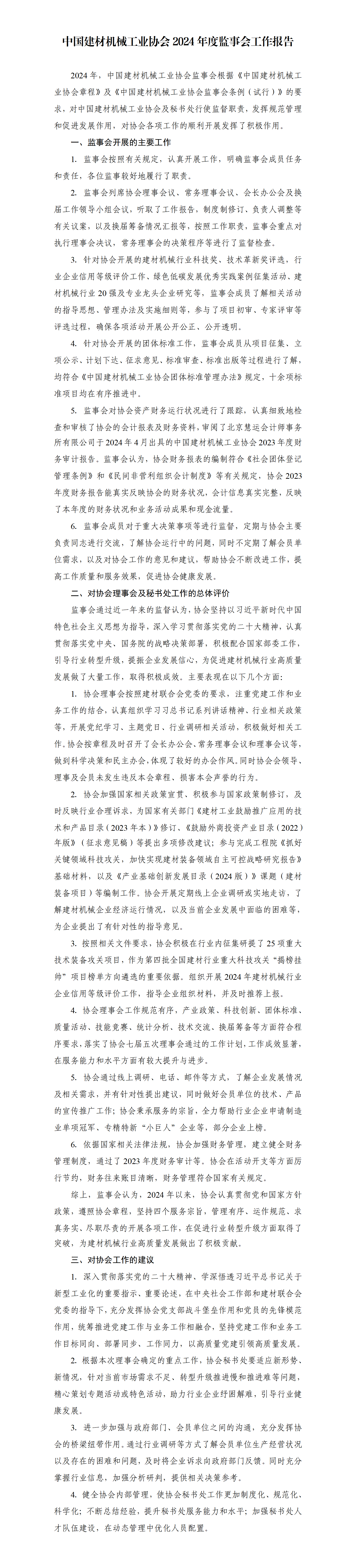 中国建材机械工业协会2024年度监事会工作报告