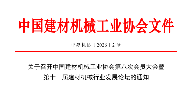 中国建材机械工业协会第七届理事会任期届满,根据协会章程规定,经协会换届工作领导小组研究,协会定于2026年1月18日至20日在江苏省苏州市召开“中国建材机械工业协会第八次会员大会暨第十一届建材机械行业发展论坛”,会议同期召开七届十三次常务理事会议、八届一次理事会议、二届一次监事会议。现将有关事项通知如下: