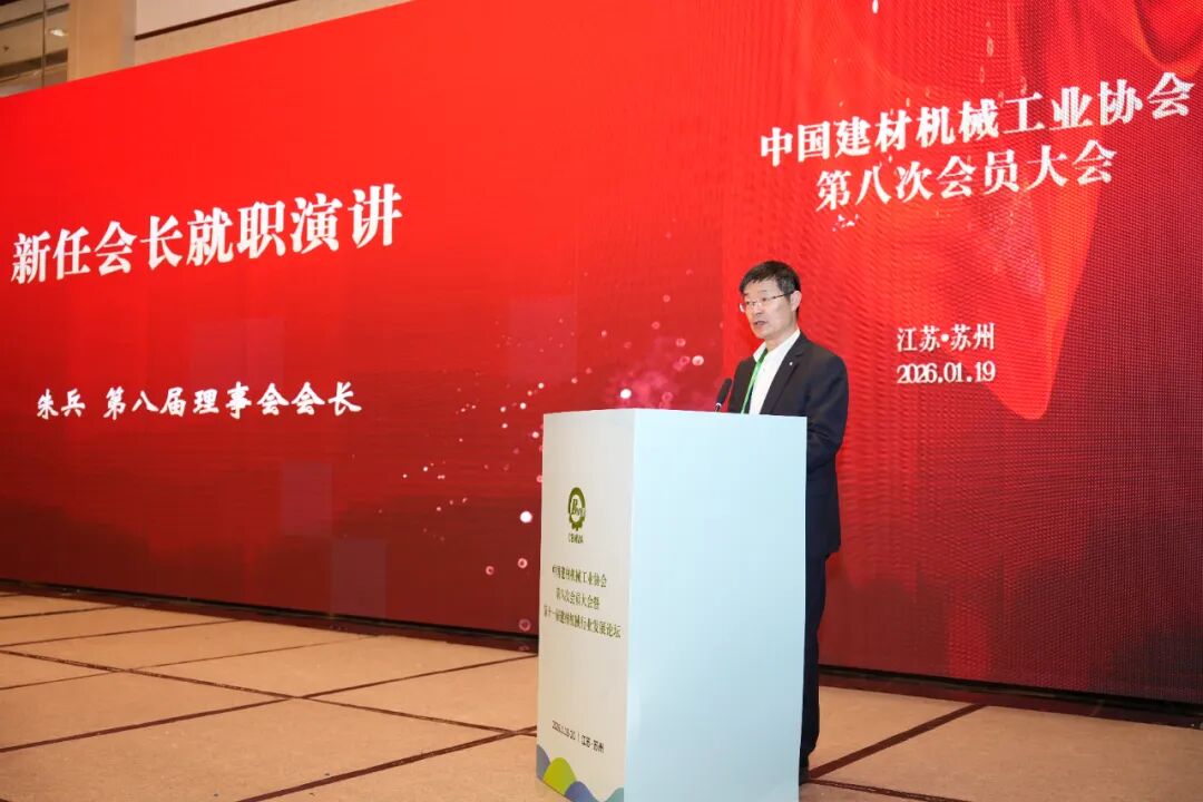 新任会长朱兵在就职讲话中,感谢协会广大会员代表的信任和支持,感谢长期以来关心和支持行业发展的领导以及第七届理事会为行业做出的重大贡献。特别感谢建材联合会党委多年来的指导与关怀。他结合当前建材机械行业面临的形势,对第八届理事会提出四点工作建议和要求,共同推动我国建材机械工业迈向更高质量、更具竞争力的新征程。一是强化政策引导,筑牢行业发展根基。紧密对接国家产业政策导向,加强行业调研与政策建言,推进绿色低碳、数字智能转型,为行业发展争取更有利的政策环境。二是聚焦科技创新,激活产业升级动能。搭建行业创新平台,推动核心技术攻关与成果转化。积极推广先进节能技术装备,引导企业向服务型制造转型。三是深化服务赋能,凝聚会员发展合力。针对企业多元化需求,举办更多精准对接活动与专业培训,助力中小企业成长,支持龙头企业做强做优。加强行业经济运行分析,为企业决策提供参考。四是拓展国际视野,提升全球竞争能力。积极搭建国际交流合作平台,组织企业参与国内外知名展会,深化与“一带一路”沿线国家及新兴市场的合作对接,助力我国建材机械装备扩大出口、布局海外产能。同时,引导企业熟悉国际规则、提升合规能力,在全球产业链重构中提升竞争力。