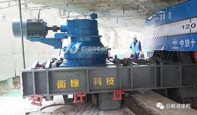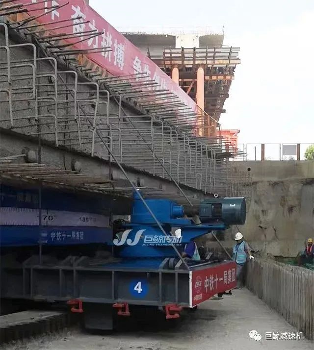转体时启动变频电机及减速机,带动齿轮进行转动,通过齿条的传动带动滚轮小车沿轨道移动,中国建材机械工业协会常务理事单位荆州市巨鲸传动机械有限公司为该项目配套的减速机运行平稳、顺利。