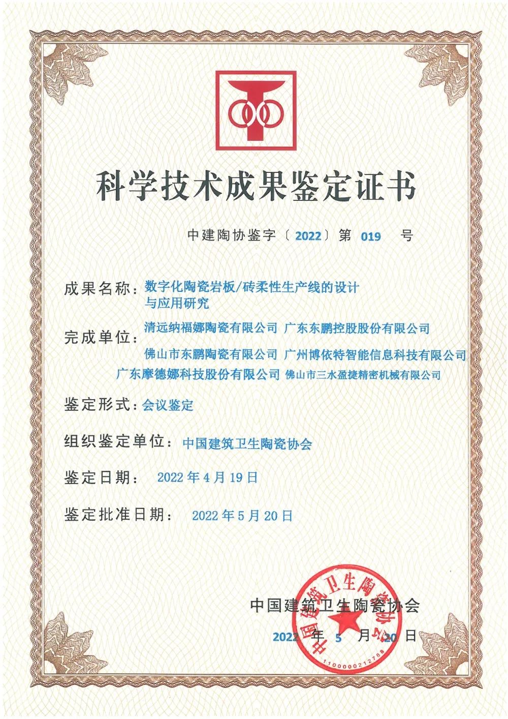 日前,摩德娜INFINITY双层窑炉生产线所在的东鹏清远基地数字化陶瓷岩板生产线通过了中国建筑卫生陶瓷协会的鉴定,被评定成果:数字化陶瓷岩板/砖柔性生产线的设计与应用研究,并颁发了科学技术成果鉴定证书。