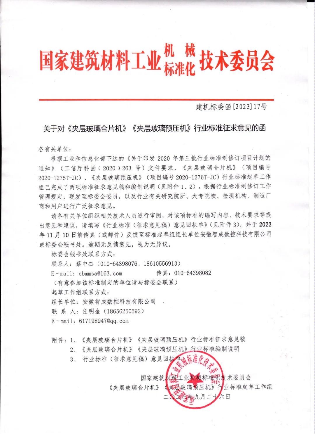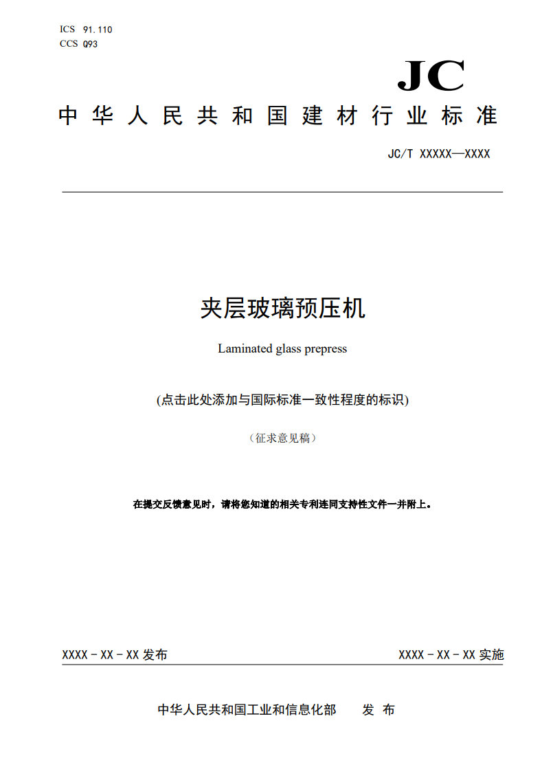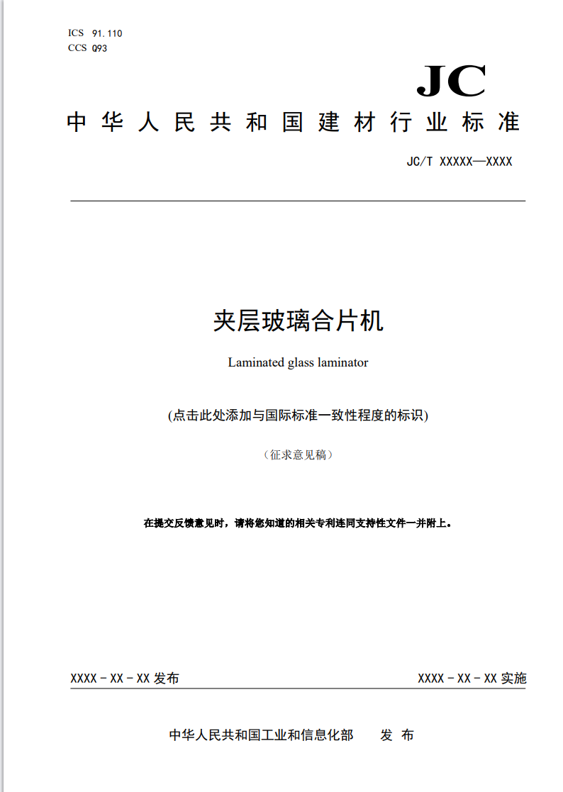 根据工业和信息化部下达的《关于印发2020年第三批行业标准制修订项目计划的通知》(工信厅科函﹝2020﹞263号)文件要求,《夹层玻璃合片机》(项目编号2020-1275T-JC)、《夹层玻璃预压机》(项目编号2020-1276T-JC)行业标准起草工作组已完成了两项标准征求意见稿和编制说明(见附件1、2)。根据行业标准制修订工作管理规定,现发至标委会委员,以及行业有关研究院所、大专院校、检测机构、制造厂商和用户进行广泛征求意见。