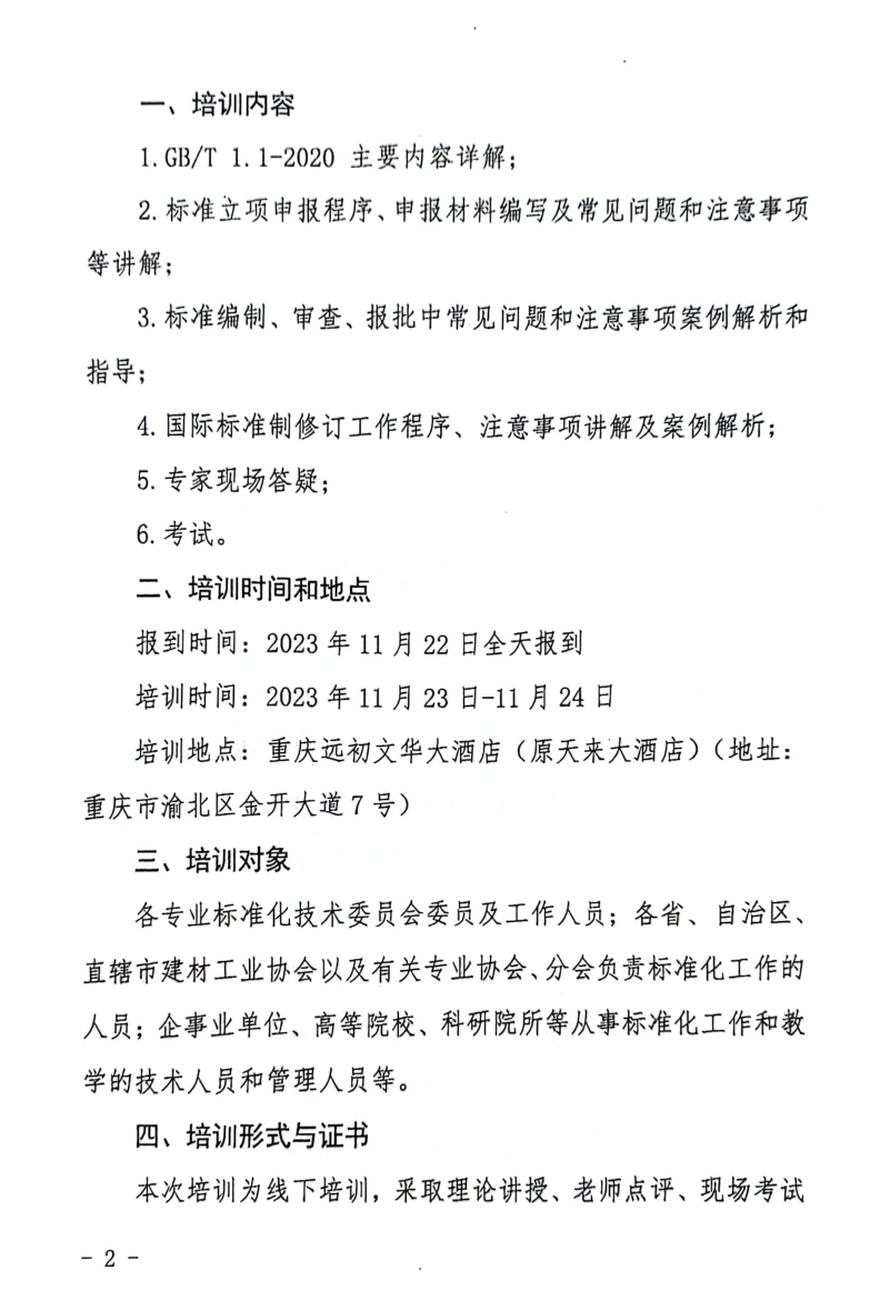 为贯彻落实《国家标准化发展纲要》《“十四五”推动高质量发展的国家标准体系建设规划》要求,加强建材行业标准化专业人才能力建设,培养和建设一支熟练掌握国际规则,同时具有科研能力、标准化能力的专业标准化人才队伍,提高建材行业标准化工作质量和水平,建设行业标准化高端智库,助力建材行业绿色低碳安全高质量发展,根据《建材行业标准化工作人员资质管理暂行办法》相关要求,中国建筑材料联合会于11月22-24日组织召开2023年度建筑材料行业标准化人才高级培训班。中国建材机械工业协会、全国建材装备标准化技术委员会、国家建筑材料工业机械标准化技术委员会为此次培训班的承办单位。欢迎建材机械领域标准化工作人员、标委会委员、标准起草人员积极参加。