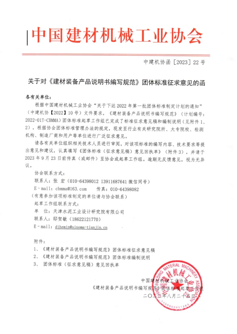 根据中国建材机械工业协会“关于下达2022年第一批团体标准制定计划的通知”(中建机协【2022】10号)文件要求,《建材装备产品说明书编写规范》(计划编号:2022-01T-CBMMA)团体标准起草工作组已完成了标准征求意见稿和编制说明(见附件1、2), 根据协会团体标准管理办法的规定,现向行业有关研究院所、大专院校、检测机构、制造厂商和用户等单位进行广泛征求意见。具体详情见下方文件: